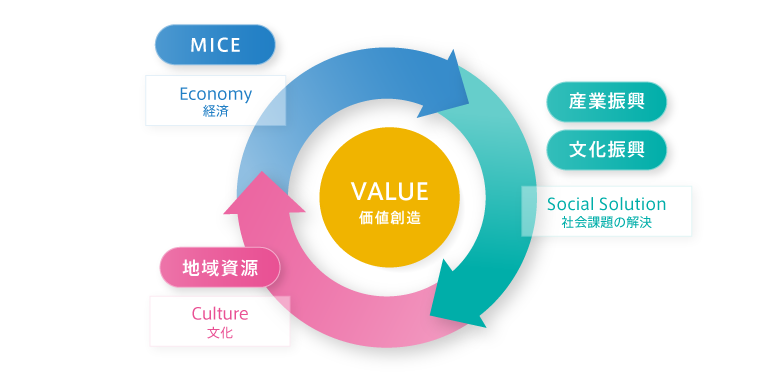国際会議・展示会・スポーツイベントを起点に、国・自治体、企業・団体、教育・研究機関や施設など、多様なステークホルダーをつなぎます。