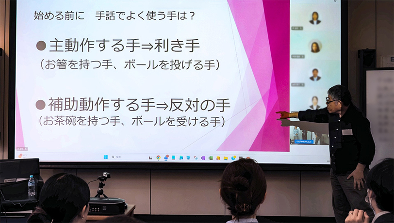 講座当日は、発案者である社員が講師を務め、手話の基本や背景について紹介した後、あいさつや名前の表現など、実践的な内容を学びました。後半には参加者同士でペアを組み、手話による自己紹介に取り組むなど、体験を通じて理解を深めました。