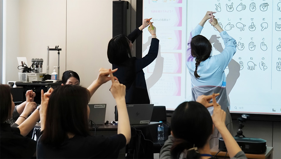 参加者からは、「手話を通じて自己紹介ができるようになった」、「新しい言語を学ぶ楽しさを感じた」、「今後、多様な人と関わるうえで、コミュニケーションのあり方を意識していきたい」といった声が寄せられました。今回の講座は、手話そのものを学ぶだけでなく、多様な人と関わる上で大切な視点を見つめ直す機会にもなりました。