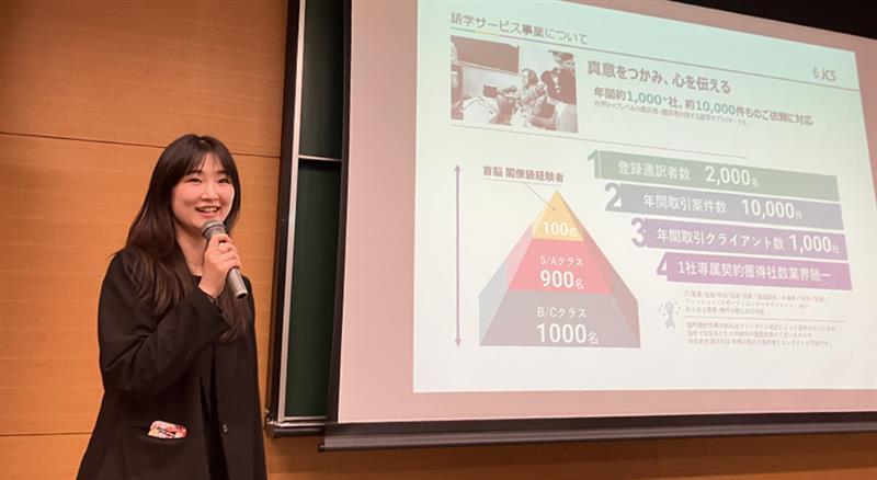 当社通訳手配管理部の御木が、大妻女子大学の講義「キャリアデザインⅡ・Ⅲ」に、2025年12月1日(月)、ゲストスピーカーとして登壇しました。本講義は、学生の皆さんが、将来の働き方や自身の価値観を整理し、主体的なキャリア選択につなげることを目的として実施されています。