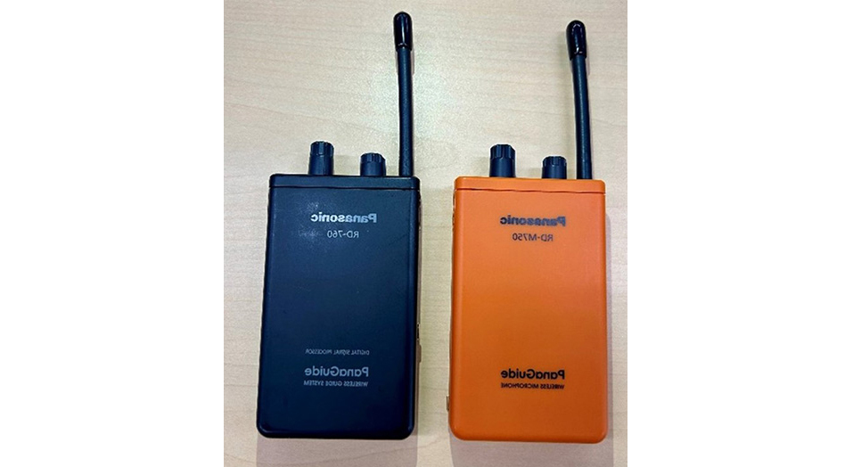 パナガイドは、パナソニック社製の携帯型無線ガイドシステムです。マイク付きの無線送信機から、イヤホン付き無線受信機へ一斉に音声を届けることができます。主に美術館や機械の騒音が発生する工場見学などのツアーガイドで使用されますが、同時通訳の現場でも使われています。